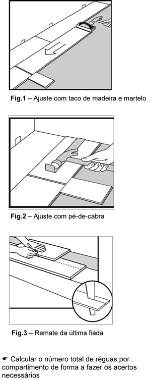 » Trabalhar da esquerda para a direita, posicionando a primeira régua com a fêmea voltada para a parede. Utilizar espaçadores para deixar a junta de dilatação. Prossegue-se o encaixe topo a topo das réguas promovendo o encaixe com a ajuda de um taco de madeira ou plástico e aplicando-se uma linha de cola na face inferior da fêmea (sistema flutuante) – fig.1
