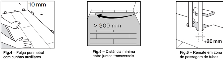 » Para permitir as dilatações/retracções normais da madeira (variam de espécie para espécie e podem atingir +/- 1% na largura e +/- 0,3% no comprimento) é fundamental deixar uma junta de dilatação perimetral mínima de 10 mm entre o pavimento e as paredes, pilares, tubos de aquecimento, escadas ou qualquer outro elemento fixo. Estas juntas serão tapadas com o rodapé, perfis de alumínio/pvc, ripas auto adesivas, silicones, etc.